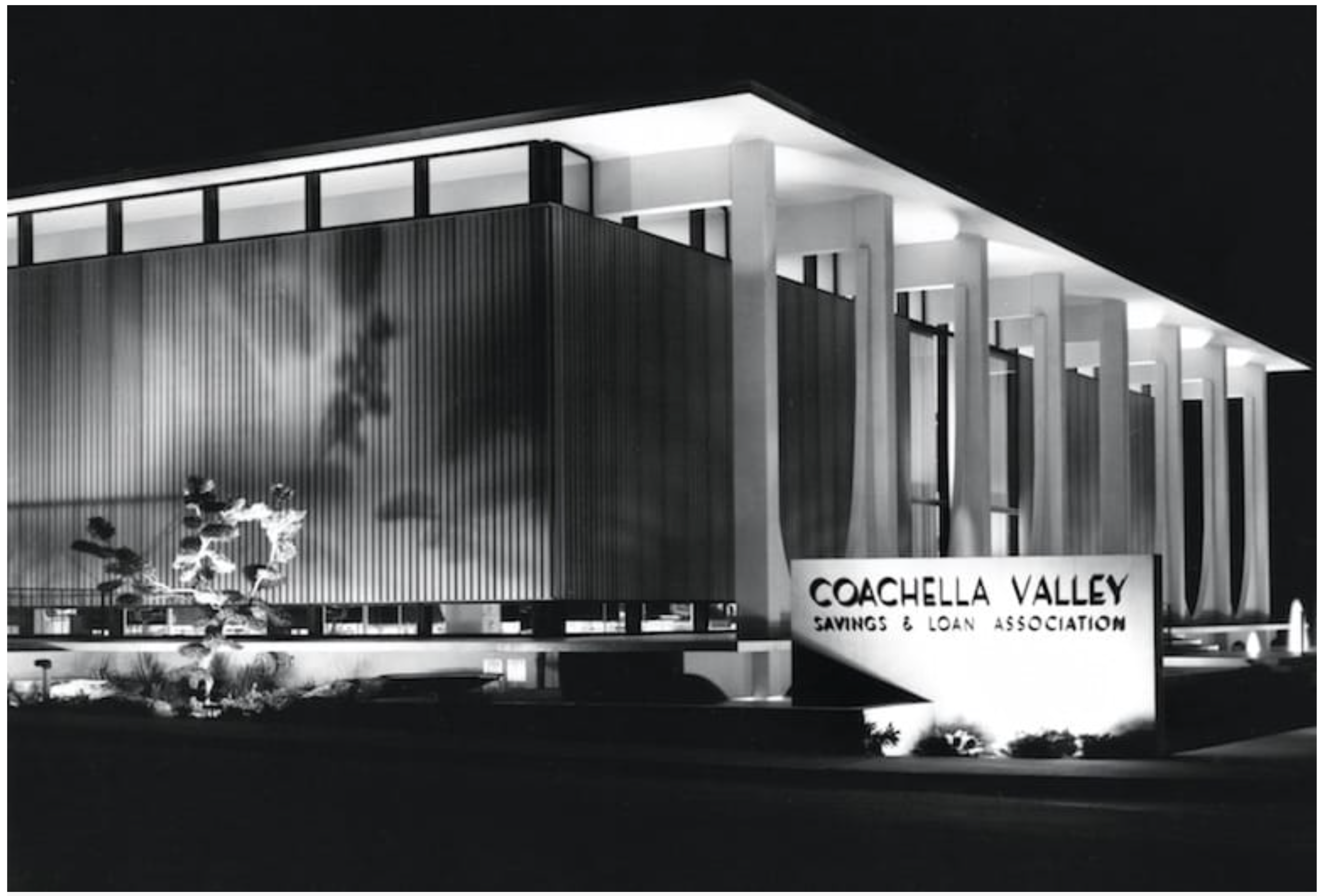 Historically, Coachella Valley Savings and Loan played an important role in financing the region’s rapid mid-century growth, supporting housing developments, businesses, and tourism infrastructure as Palm Springs expanded into a national destination. The continued use of the building as a bank underscores both the durability of its original design and the foresight of its architect. Even with modern branding and interior changes, the structure remains a tangible link to the era when Palm Springs’ financial institutions helped define the city’s distinctive modern identity.